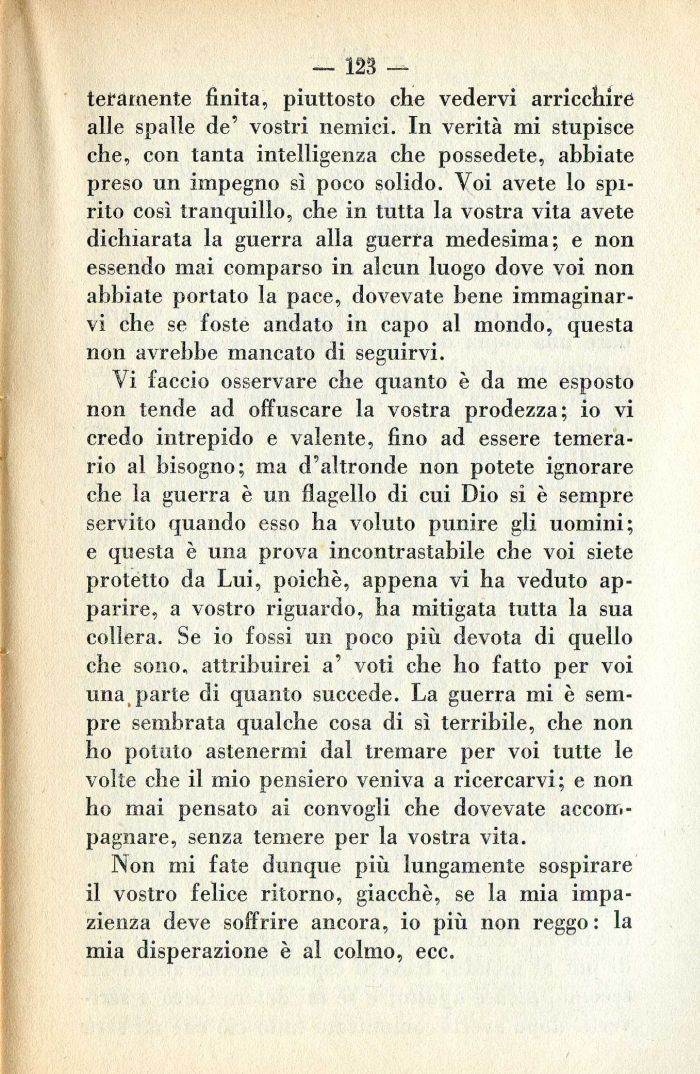 terarnente finita, piuttosto che vedervi arricchire alle spalle de' vostri nemici. In verità mi stupisce che, con tanta intelligenza che possedete, abbiate preso un impegno si poco solido. Voi avete lo spirito così tranquillo, che in tutta la vostra vita avete dichiarata la guerra alla guerra medesima; e non essendo mai comparso in alcun luogo dove voi non abbiate portato la pace, dovevate bene immaginarvi che se foste andato in capo al mondo, questa non avrebbe mancato di seguirvi.