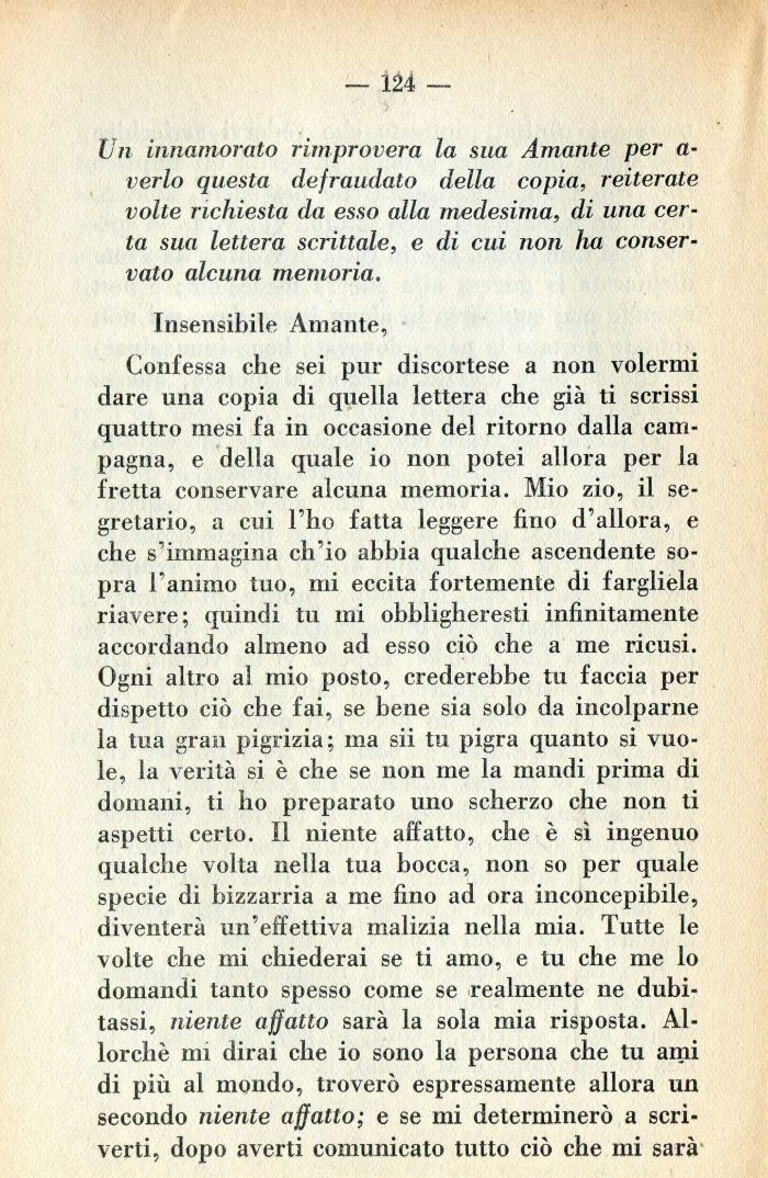 Un innamorato rimprovera la sua Amante per a-verlo questa defraudato della copia, reiterate volte richiesta da esso alla medesima, di una certa sua lettera scrittale, e di cui non ha conservato alcuna memoria.
