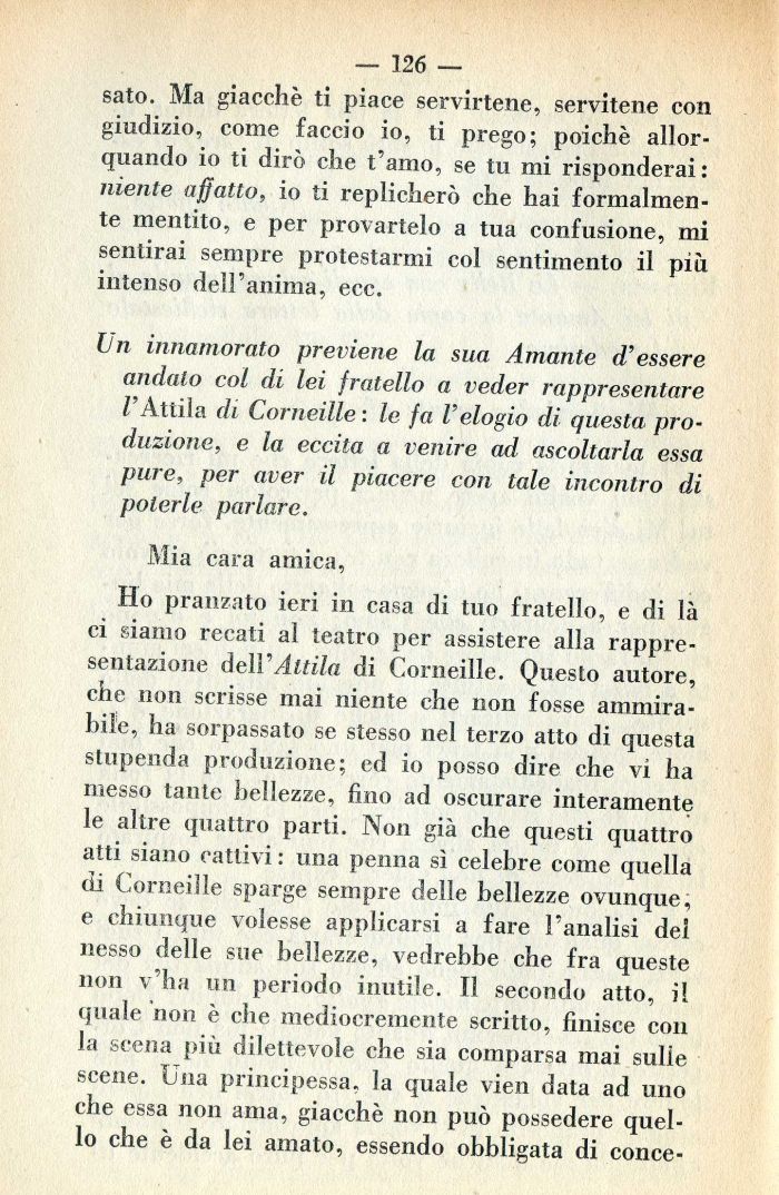 Ho pranzato ieri in casa di tuo fratello, e di là ci siamo recati al teatro per assistere alla rappresentazione dell'Aitila di Corneille. Questo autore, che non scrisse mai niente che non fosse ammirabile, ha sorpassato se stesso nel terzo atto di questa stupenda produzione; ed io posso dire che vi ha messo tante bellezze, fino ad oscurare interamente le altre quattro parli. Non già che questi quattro atti siano cattivi : una penna sì celebre come quella di Corneille sparge sempre delle bellezze ovunque, e chiunque volesse applicarsi a fare l'analisi del nesso delle sue bellezze, vedrebbe che fra queste non v'ha un periodo inutile. Il secondo atto, il quale non è che mediocremente scritto, finisce con la scena più dilettevole che sia comparsa mai sulle scene. Una principessa, la quale vien data ad uno che essa non ama, giacché non può possedere quello che è da lei amato, essendo obbligata di conce-