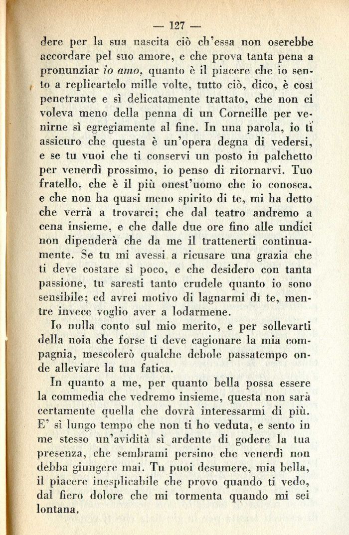In quanto a me, per quanto bella possa essere la commedia che vedremo insieme, questa non sarà certamente quella che dovrà interessarmi di più. E' sì lungo tempo che non ti ho veduta, e sento in me stesso un'avidità sì ardente di godere la tua presenza, che sembrami persino che venerdì non debba giungere mai. Tu puoi desumere, mia bella, il piacere inesplicabile che provo quando ti vedo, dal fiero dolore che mi tormenta quando mi sei lontana.