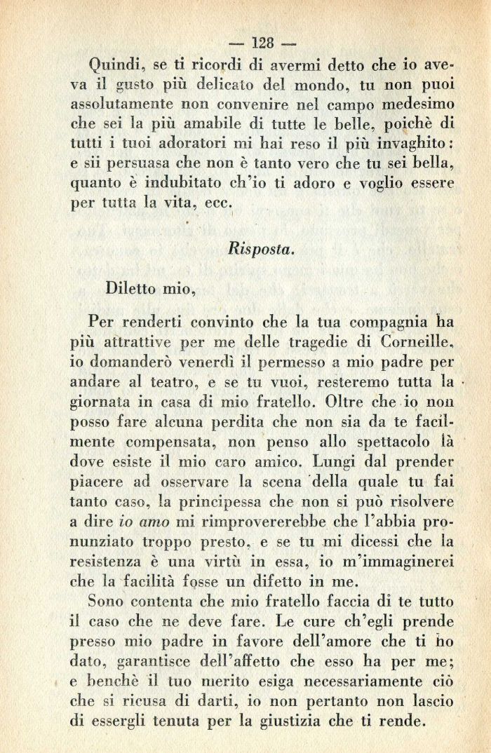 10 domanderò venerdì il permesso a mio padre per andare al teatro, e se tu vuoi, resteremo tutta la giornata in casa di mio fratello. Oltre che io non posso fare alcuna perdita che non sia da te facilmente compensata, non penso allo spettacolo là dove esiste il mio caro amico. Lungi dal prender piacere ad osservare la scena della quale tu fai tanto caso, la principessa che non si può risolvere a dire io amo mi rimprovererebbe che l'abbia pronunziato troppo presto, e se tu mi dicessi che la resistenza è una virtù in essa, io m'immaginerei che la facilità fosse un difetto in me.