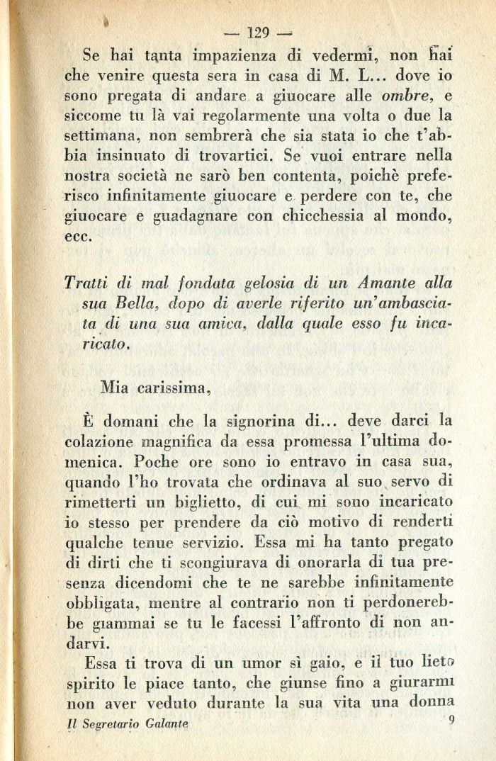 Se hai tanta impazienza di vedermi, non hai che venire questa sera in casa di M. L... dove io sono pregata di andare a giuocare alle ombre, e siccome tu là vai regolarmente una volta o due la settimana, non sembrerà che sia stata io che t'abbia insinuato di trovartici. Se vuoi entrare nella nostra società ne sarò ben contenta, poiché preferisco infinitamente giuocare e perdere con te, che giuocare e guadagnare con chicchessia al mondo, ecc.