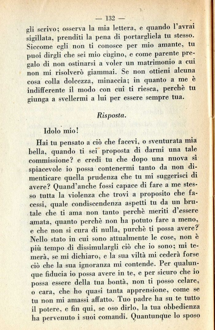Hai tu pensato a ciò che facevi, o sventurata mia bella, quando ti sei proposta di darmi una tale commissione? e credi tu che dopo una nuova sì spiacevole io possa contenermi tanto da non dimenticare quella prudenza che tu mi suggerisci di avere? Quand'anche fossi capace di fare a me stesso tutta la violenza che trovi a proposito che facessi, quale condiscendenza aspetti tu da un brutale che ti ama non tanto perchè meriti d'essere amata, quanto perchè non ha potuto fare a meno, e che non si cura di nulla, purché ti possa avere? Nello stato in cui sono attualmente le cose, non è più tempo di dissimulargli ciò che io sono; mi temerà, se mi dichiaro, e la sua viltà mi cederà forse ciò che la sua ignoranza mi contende. Per qualunque fiducia io possa avere in te, e per sicuro che io possa essere della tua bontà, non ti posso celare, o cara, che ho quasi tanta apprensione, come se tu non mi amassi affatto. Tuo padre ha su te tutto il potere, e fin qui, se oso dirlo, la tua obbedienza ha pervenuto i suoi comandi. Quantunque lo sposo