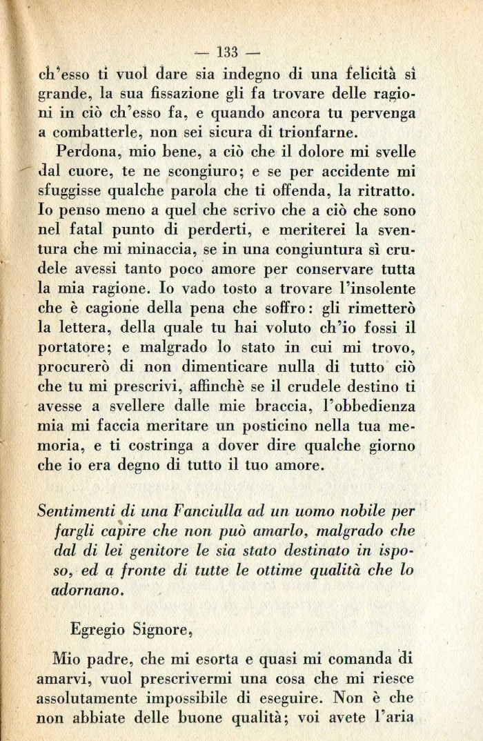 Sentimenti di una Fanciulla ad un uomo nobile per fargli capire che non può amarlo, malgrado che dal di lei genitore le sia stato destinato in ispo-so, ed a fronte di tutte le ottime qualità che lo adornano.