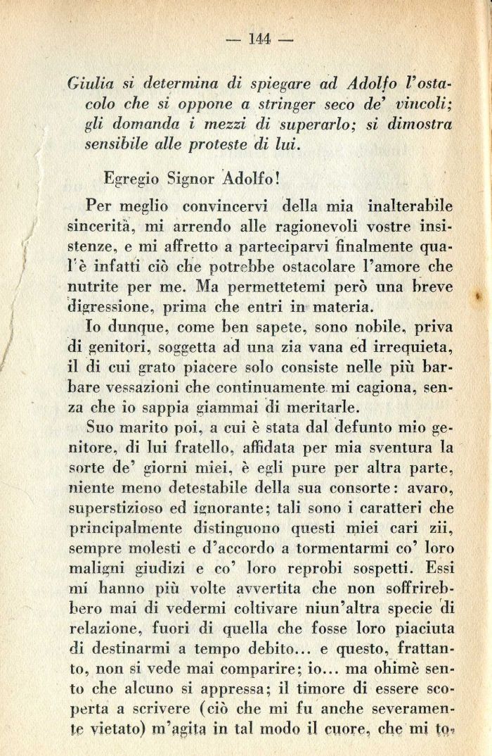 Io dunque, come ben sapete, sono nobile, priva di genitori, soggetta ad una zia vana ed irrequieta, il di cui grato piacere solo consiste nelle più barbare vessazioni che continuamente mi cagiona, senza che io sappia giammai di meritarle.
