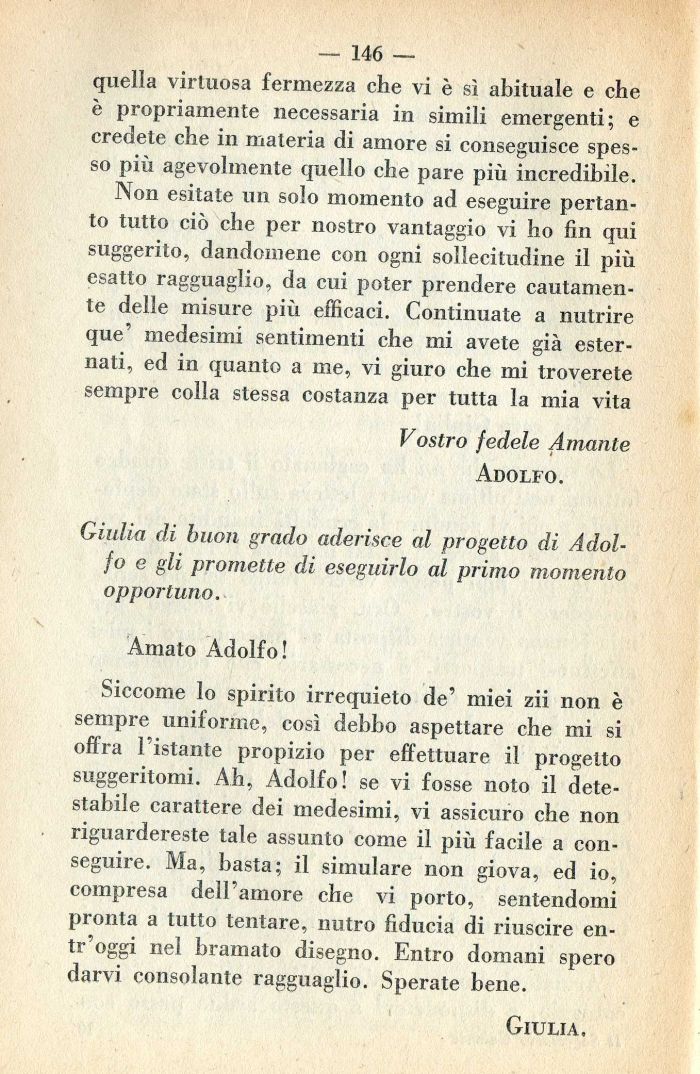 Siccome lo spirito irrequieto de' miei zii non è sempre uniforme, così debbo aspettare che mi si offra l'istante propizio per effettuare il progetto suggeritomi. Ah, Adolfo! se vi fosse noto il detestabile carattere dei medesimi, vi assicuro che non riguardereste tale assunto come il più facile a conseguire. Ma, basta; il simulare non giova, ed io, compresa dell'amore che vi porto, sentendomi pronta a tutto tentare, nutro fiducia di riuscire en-tr'oggi nel bramato disegno. Entro domani spero darvi consolante ragguaglio. Sperate bene.