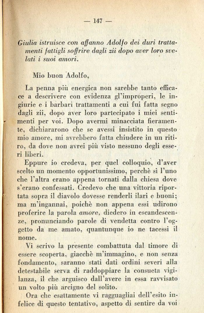 Vi scrivo la presente combattuta dal timore di essere scoperta, giacché m'immagino, e non senza fondamento, saranno stati dati ordini severi alla detestabile serva di raddoppiare la consueta vigilanza, il che arguisco dall'avere in essa ravvisato un volto più arcigno del solito.