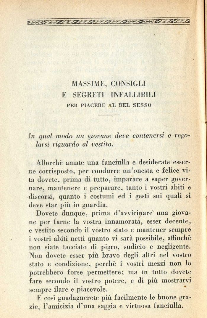 Dovete dunque, prima d'avvicinare una giovane per farne la vostra innamorata, esser decente., e vestito secondo il vostro stato e mantener sempre i vostri abiti netti quanto vi sarà possibile, affinchè non siate tacciato di pigro, sudicio e negligente. Non dovete esser più bravo degli altri nel vostro stato e condizione, perchè i vostri mezzi non lo potrebbero forse permettere; ma in tutto dovete fare secondo il vostro potere, e di più mostrarvi sempre ilare e piacevole.