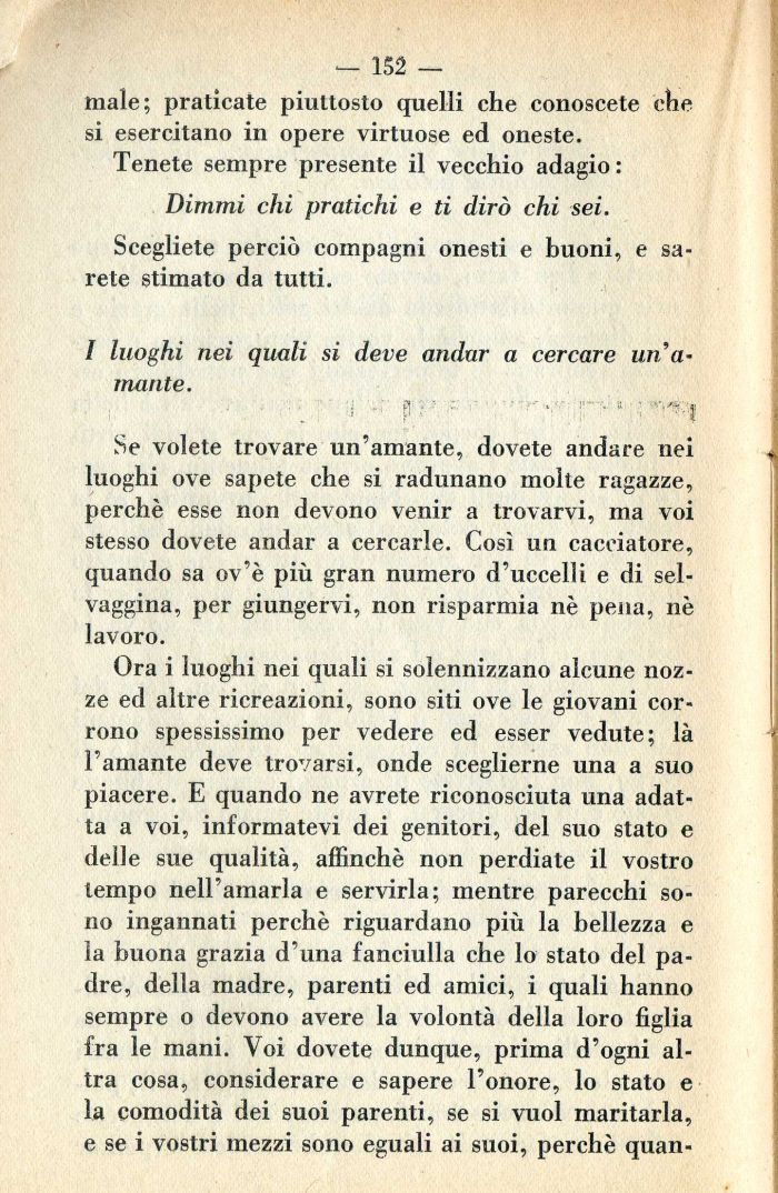 Ora i luoghi nei quali si solennizzano alcune nozze ed altre ricreazioni, sono siti ove le giovani corrono spessissimo per vedere ed esser vedute; là l'amante deve trovarsi, onde sceglierne una a suo piacere. E quando ne avrete riconosciuta una adatta a voi, informatevi dei genitori, del suo stato e delle sue qualità, affinchè non perdiate il vostro tempo nell'amarla e servirla; mentre parecchi sono ingannati perchè riguardano più la bellezza e la buona grazia d'una fanciulla che lo stato del padre, della madre, parenti ed amici, i quali hanno sempre o devono avere la volontà della loro figlia fra le mani. Voi dovete dunque, prima d'ogni altra cosa, considerare e sapere l'onore, lo stato e la comodità dei suoi parenti, se si vuol maritarla, e se i vostri mezzi sono eguali ai suoi, perchè quan-