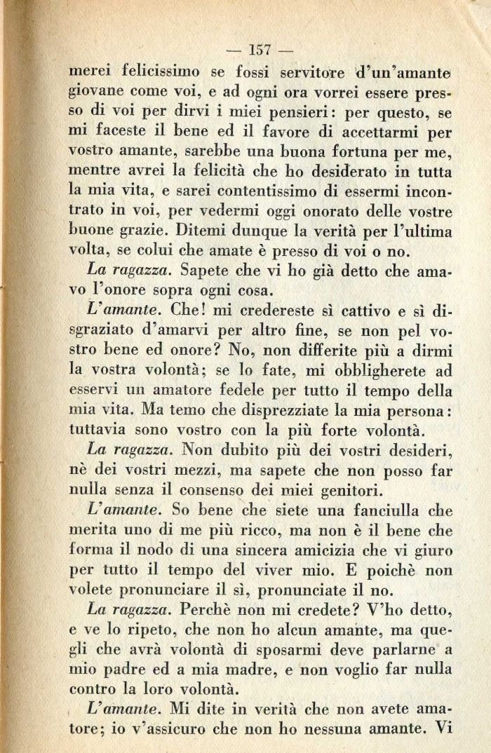 merei felicissimo se fossi servitore d'un'ainante giovane come voi, e ad ogni ora vorrei essere presso di voi per dirvi i miei pensieri : per questo, se mi faceste il bene ed il favore di accettarmi per vostro amante, sarebbe una buona fortuna per me, mentre avrei la felicità che ho desiderato in tutta la mia vita, e sarei contentissimo di essermi incontrato in voi, per vedermi oggi onorato delle vostre buone grazie. Ditemi dunque la verità per l'ultima volta, se colui che amate è presso di voi o no.