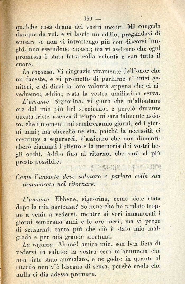 L'amante. Signorina, vi giuro che m'allontano ora dal mio più bel soggiorno; e perciò durante questa triste assenza il tempo mi sarà talmente noioso, che i momenti mi sembreranno giorni, ed i giorni anni; ma checché ne sia, poiché la necessità ci costringe a separarci, v'assicuro che non dimenticherò giammai l'effetto e la memoria dei vostri begli occhi. Addio fino al ritorno, che sarà al più presto possibile.