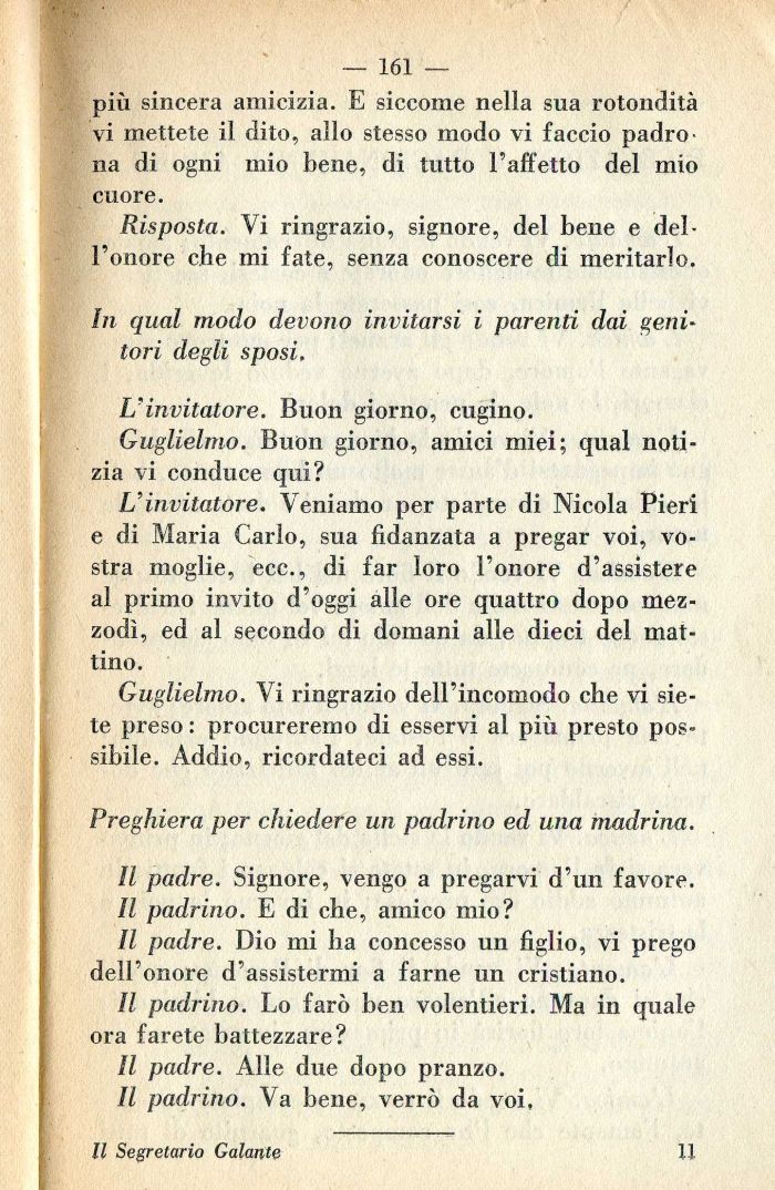 L'invitatore. Veniamo per parte di Nicola Pieri e di Maria Carlo, sua fidanzata a pregar voi, vostra moglie, ecc., di far loro l'onore d'assistere al primo invito d'oggi alle ore quattro dopo mezzodì, ed al secondo di domani alle dieci del mattino.