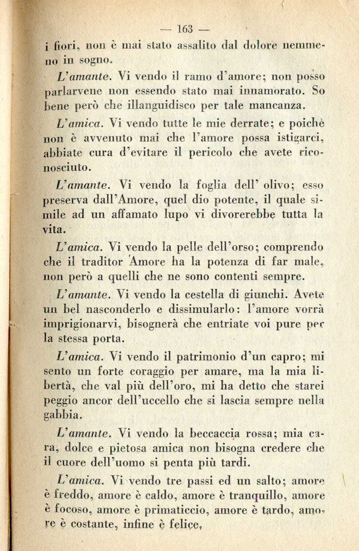 L'amica. Vi vendo tutte le mie derrate; e poiché non è avvenuto mai che l'amore possa istigarci, abbiate cura d'evitare il pericolo che avete riconosciuto.