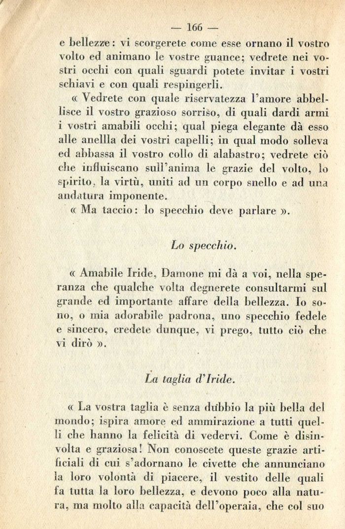« Vedrete con quale riservatezza l'amore abbellisce il vostro grazioso sorriso, di quali dardi armi i vostri amabili occhi; qua! piega elegante dà esso alle anelila dei vostri capelli; in qual modo solleva ed abbassa il vostro collo di alabastro; vedrete ciò che influiscano sull'anima le grazie del volto, lo spirito, la virtù, uniti ad nn corpo snello e ad una andatura imponente.