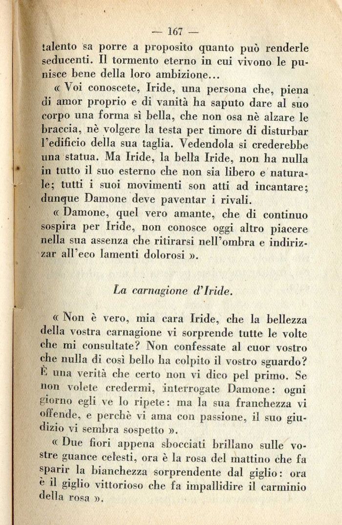 « Non è vero, mia cara Iride, che la bellezza della vostra carnagione vi sorprende tutte le volte che mi consultate? Non confessate al cuor vostro che nulla di così bello ha colpito il vostro sguardo? E una verità che certo non vi dico pel primo. Se non volete credermi, interrogate Damone : ogni giorno egli ve lo ripete: ma la sua franchezza vi offende, e perchè vi ama con passione, il suo giudizio vi sembra sospetto ».