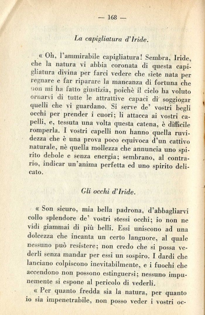 « Oh, l'ammirabile capigliatura! Sembra, Iride, che la natura vi abbia coronata di questa capigliatura divina per farci vedere che siete nata per regnare e far riparare la mancanza di fortuna che 'ìoiì mi ha fatto giustizia, poiché il cielo ha voluto ornarvi di tutte le attrattive capaci di soggiogar quelli che vi guardano. Si serve de' vostri begli occhi per prender i cuori; li attacca ai vostri capelli, e, tessuta una volta questa catena, è difficile romperla. I vostri capelli non hanno quella ruvidezza che è una prova poco equivoca d'un cattivo naturale, nè quella mollezza che annuncia uno spirito debole e senza energia; sembrano, al contrario, indicar un'anima perfetta ed uno spirito delicato.