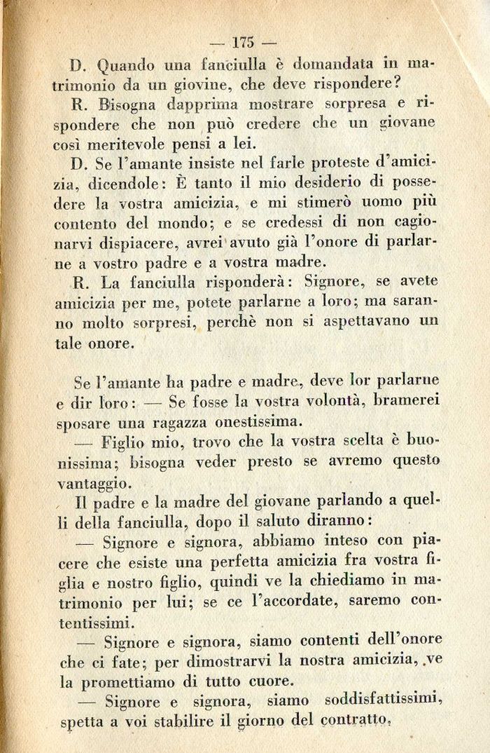 Se l'amante ha padre e madre, deve lor parlarne e dir loro: — Se fosse la vostra volontà, bramerei sposare una ragazza onestissima.