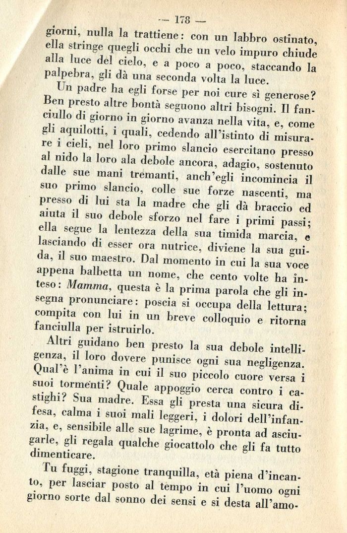 Un padre ha egli forse per noi cure sì generose? Ben presto altre bontà seguono altri bisogni. Il fanciullo di giorno in giorno avanza nella vita, e, come gli aquilotti, i quali, cedendo all'istinto di misurare i cieli, nel loro primo slancio esercitano presso al nido la loro ala debole ancora, adagio, sostenuto dalle sue mani tremanti, anch'egli incomincia il suo primo slancio, colle sue forze nascenti, ma presso di lui sta la madre che gli dà braccio ed aiuta il suo debole sforzo nel fare i primi passi; ella segue la lentezza della sua timida marcia, e lasciando di esser ora nutrice, diviene la sua guida, il suo maestro. Dal momento in cui la sua voce appena balbetta un nome, che cento volte ha inteso : Mamma, questa è la prima parola che gli insegna pronunciare: poscia si occupa della lettura; compita con lui in un breve colloquio e ritorna fanciulla per istruirlo.
