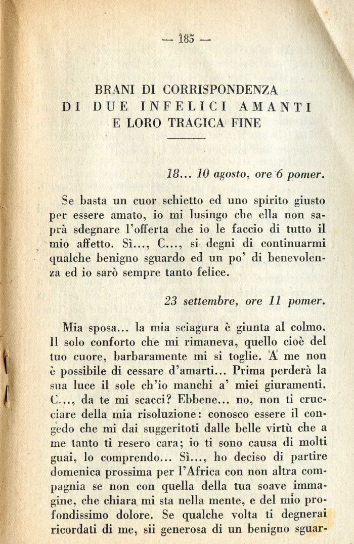 Mia sposa... la mia sciagura è giunta al colmo. 11 solo conforto che mi rimaneva, quello cioè del tuo cuore, barbaramente mi si toglie. A me non è possibile di cessare d'amarti... Prima perderà la sua luce il sole ch'io manchi a' miei giuramenti. C..., da te mi scacci? Ebbene... no, non ti crucciare della mia risoluzione : conosco essere il congedo che mi dai suggeritoti dalle belle virtù che a me tanto ti resero cara; io ti sono causa di molli guai, lo comprendo... Si..., ho deciso di partire domenica prossima per l'Africa con non altra compagnia se non con quella della tua soave immagine, che chiara mi sta nella mente, e del mio profondissimo dolore. Se qualche volta ti degnerai ricordati di me, sii generosa di un benigno sguar-