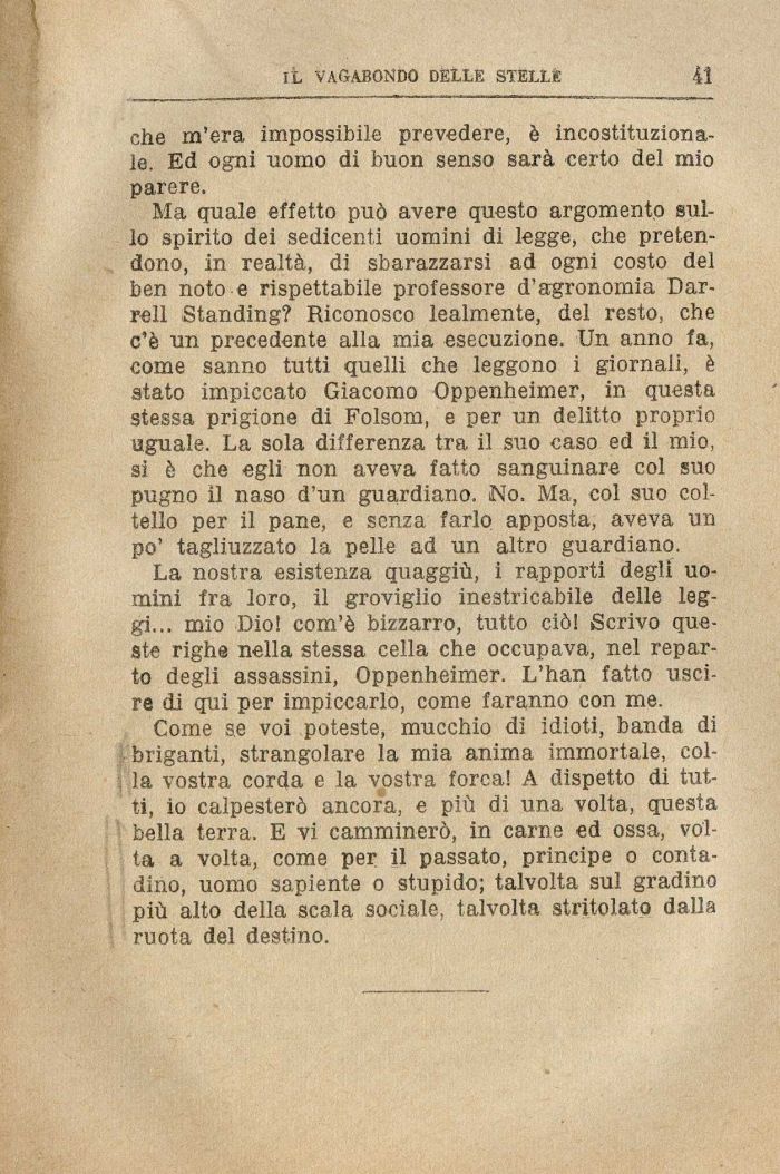 Ma quale effetto può avere questo argomento stillo spirito dei sedicenti uomini di legge, che pretendono, in realtà, di sbarazzarsi ad ogni costo del ben noto e rispettabile professore d'agronomia Dar-rell Standing? Riconosco lealmente, del resto, che c'è un precedente alla mia esecuzione. Un anno fa, come sanno tutti quelli che leggono i giornali, è stato impiccato Giacomo Oppenheimer, in questa stessa prigione di Folsom, e per un delitto proprio uguale. La sola differenza tra il suo caso ed il mio, si è che egli non aveva fatto sanguinare col suo pugno il naso d'un guardiano. No. Ma, col suo coltello per il pane, e senza farlo apposta, aveva un po' tagliuzzato la pelle ad un altro guardiano.