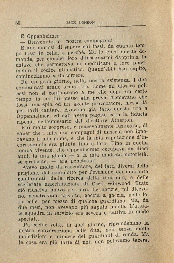 Fui molto sorpreso, e piacevolmente lusingato, di saper che i miei due compagni di miseria non ignoravano il mio nome, e che la mia reputazione d'incorreggibile era giunta fino a loro. Fino in quella tomba vivente, che Oppenheimer occupava da dieci anni, la mia gloria — o la mia modesta notorietà, se preferite, — era penetrata!