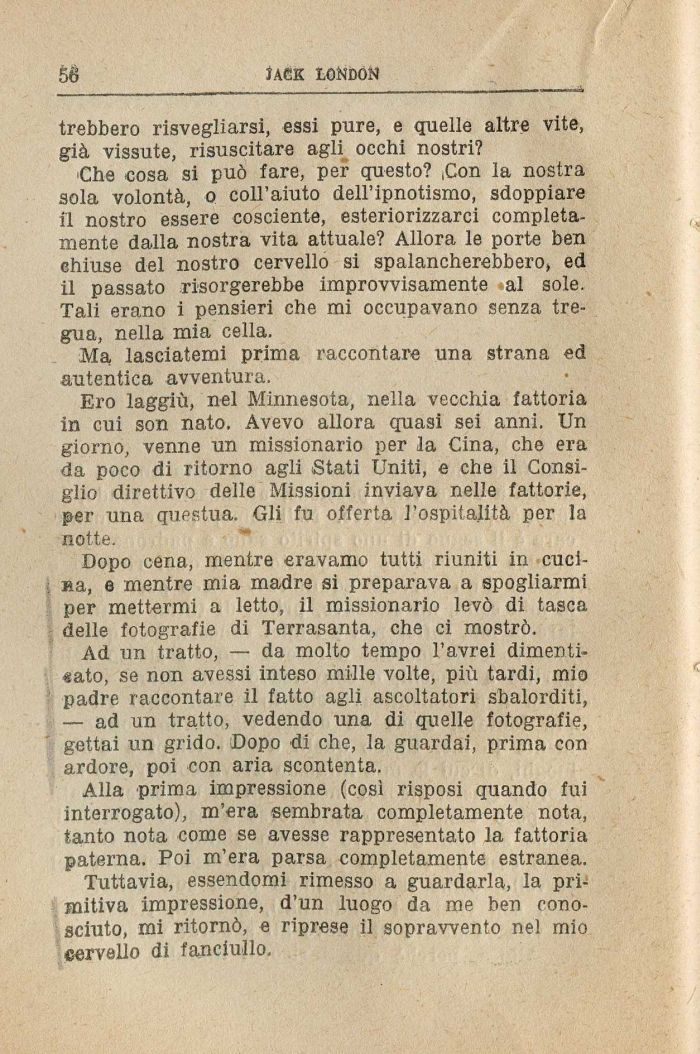 'Che cosa si può fare, per questo? ,Con la nostra sola volontà, o coli'aiuto dell'ipnotismo, sdoppiare il nostro essere cosciente, esteriorizzarci completamente dalla nostra vita attuale? Allora le porte ben chiuse del nostro cervello si spalancherebbero, ed il passato risorgerebbe improvvisamente al sole. Tali erano i pensieri che mi occupavano senza tregua, nella mia cella.