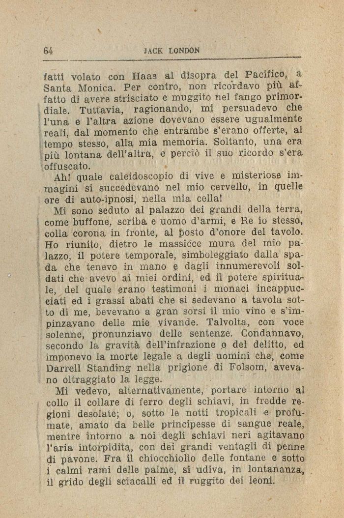 Mi sono seduto al palazzo dei grandi della terra, come buffone, scriba e uomo d'armi, e Re io stesso, colla corona in fronte, al posto d'onore del tavolo. Ho l'iunito, dietro le massicce mura del mio palazzo, il potere temporale, simboleggiato dalla spada che tenevo in mano e dagli innumerevoli soldati che avevo ai miei ordini, ed il potere spirituale, del quale erano testimoni i monaci incappucciati ed i grassi abati che si sedevano a tavola sotto di me, bevevano a gran sorsi il mio vino e s'impinzavano delle mie vivande. Talvolta, con voce solenne, pronunziavo delle sentenze. Condannavo, secondo la gravità dell'infrazione o del delitto, ed imponevo la morte legale a degli uomini che, come Darrell Standing nella prigione di Folsom, avevano oltraggiato la legge.