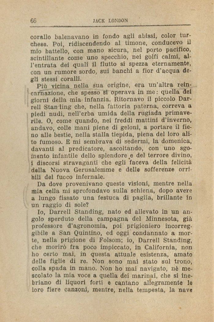 Io, Darrell Standing, nato ed allevato in un angolo sperduto della campagna del Minnesota, già professore d'agronomia, poi prigioniero incorreggibile a San Quintino, ed oggi condannato a morte, nella prigione di Folsom; io, Darrell Standing, che morirò fra poco impiccato, in California, non ho certo mai, in questa attuale esistenza, amato delle figlie di re. Non sono mai stato sul trono, colla spada in mano. Non ho mai navigato, nè mescolato la mia voce a quella dei marinai, che si inebriano di liquori forti e cantano allegramente le loro fiere canzoni, mentre, nella tempesta, la nave