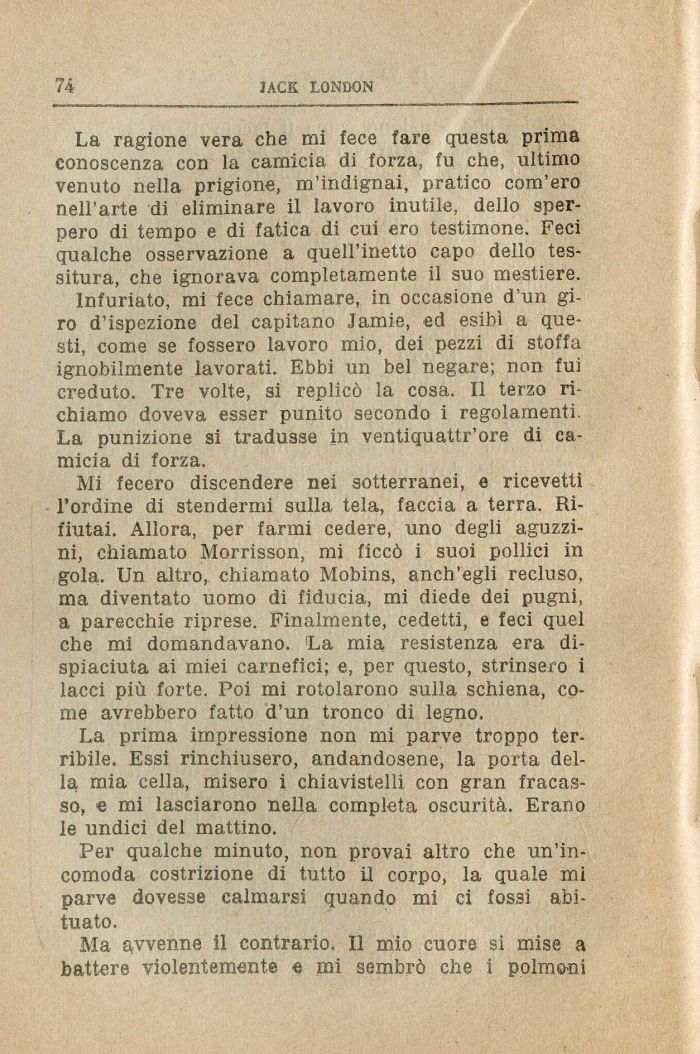 La ragione vera che mi fece fare questa prima conoscenza con la camicia di forza, fu che, ultimo venuto nella prigione, m'indignai, pratico com'ero nell'arte di eliminare il lavoro inutile, dello sperpero di tempo e di fatica di cui ero testimone. Feci qualche osservazione a quell'inetto capo dello tessitura, che ignorava completamente il suo mestiere.