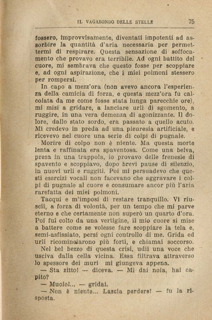 In capo a mezz'ora (non avevo ancora l'esperienza della camicia di forza, e questa mezz'ora fu calcolata da me come fosse stata lunga parecchie ore), mi misi a gridare, a lanciare urli di sgomento, a ruggire, in una vera demenza di agonizzante. Il dolore, dallo stato sordo, era passalo a quello acuto. Mi credevo in preda ad una pleuresia artificiale, e ricevevo nel cuore una serie di colpi di pugnale.