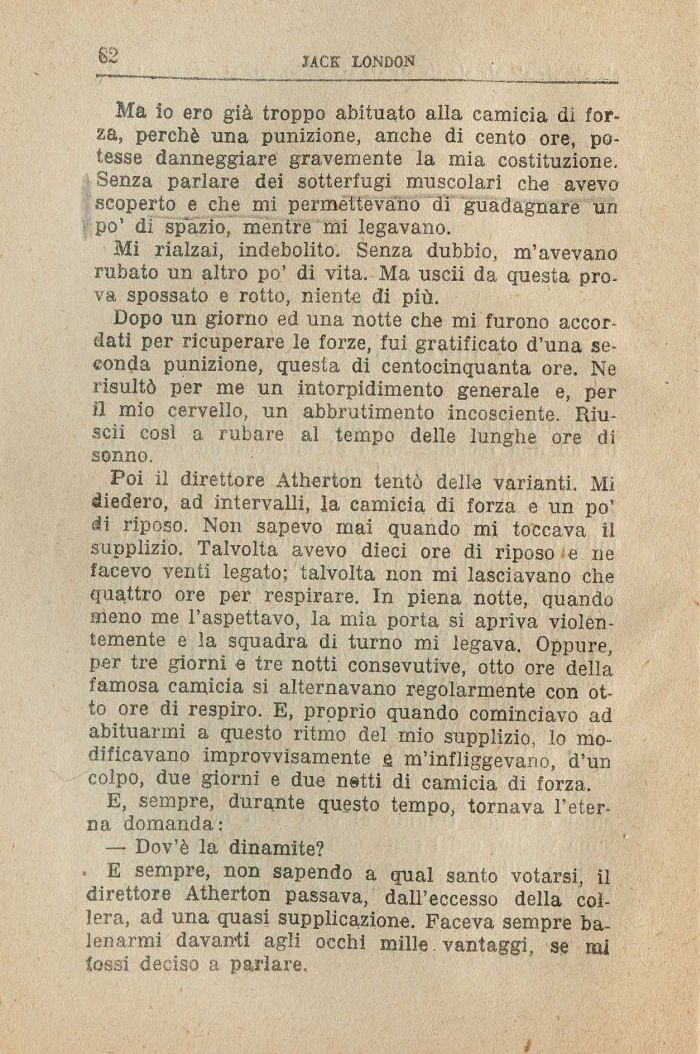 Poi il direttore Atherton tentò delle varianti. Mi diedero, ad intervalli, la camicia di forza e un po' di riposo. Non sapevo mai quando mi toccava il supplizio. Talvolta avevo dieci ore di riposo e ne facevo venti legato; talvolta non mi lasciavano che quattro ore per respirare. In piena notte, quando meno me l'aspettavo, la mia porta si apriva violentemente e la squadra di turno mi legava. Oppure, per tre giorni e tre notti consevutive, otto ore della famosa camicia si alternavano regolarmente con otto ore di respiro. E, proprio quando cominciavo ad abituarmi a questo ritmo del mio supplizio, lo modificavano improvvisamente e m'infliggevano, d'un colpo, due giorni e due netti di camicia di forza.