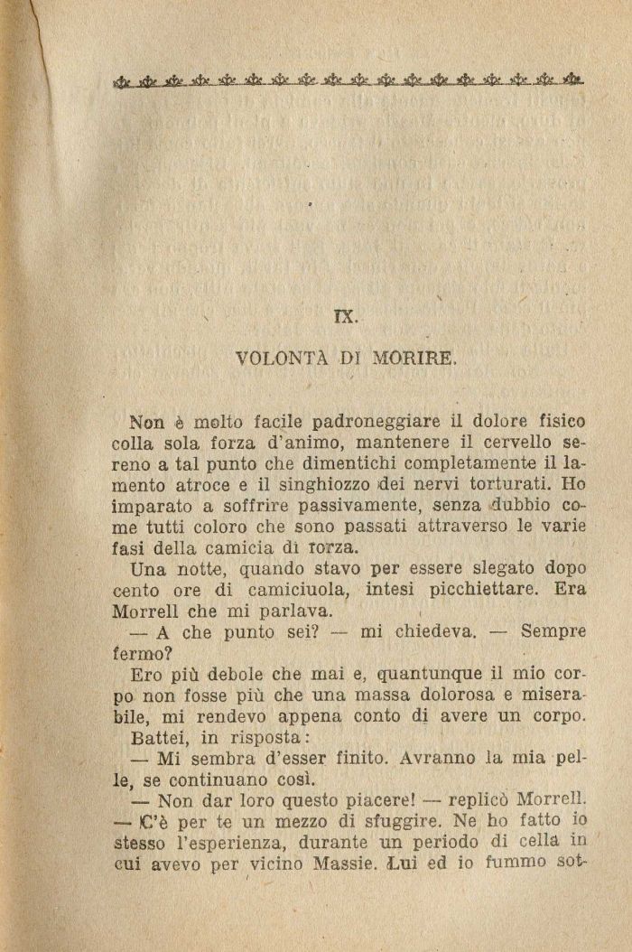 Non è molto facile padroneggiare il dolore fisico colla sola forza d'animo, mantenere il cervello sereno a tal punto che dimentichi completamente il lamento atroce e il singhiozzo dei nervi torturati. Ho imparato a soffrire passivamente, senza dubbio come tutti coloro che sono passati attraverso le varie fasi della camicia di rorza.