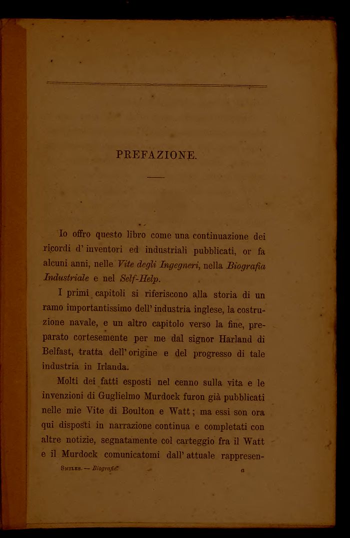 Io offro questo libro come una continuazione dei ricordi d'inventori ed industriali pubblicati, or fa alcuni anni, nelle Vite degli Ingegneri, nella Biografia Industriale e nel Self-Help.