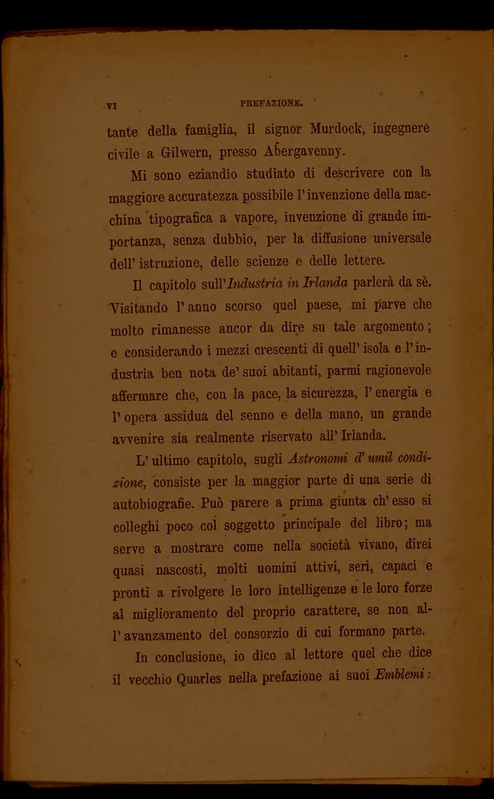 L' ultimo capitolo, sugli Astronomi (T umil condizione, consiste per la maggior parte di una serie di autobiografie. Puņ parere a prima giunta ch'esso si colleghi poco col soggetto principale del libro; ma serve a mostrare come nella societą vivano, direi quasi nascosti, molti uomini attivi, seri, capaci e pronti a rivolgere le loro intelligenze e le loro forze al miglioramento del proprio carattere, se non all'avanzamento del consorzio di cui formano parte.