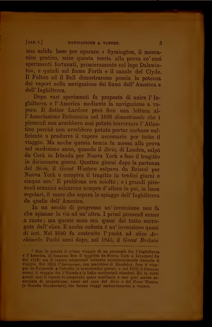 1 Non fu questo il primo viaggio di un piroscafo fra l'Inghilterra e l'America. Il Savanna fece il tragitto da Nuova York a Liverpool fin dnl 1 Si9: ma ii vapore adoperossi soltanto occasionalmente durante il viaggio. Nel 1825 VIntrapresa, con macelline di Maudslay, fece il viaggio da Falraonth « Calcutta in centotredici giorni; e nel IS'28, il Curarla compi il viaggio fra l'Olanda e le Indie occidentali olandesi. Ma in tutti questi casi il vaporo fu adoperato quale ausiliario e non qual mezzo essenziale di propulsiono, come nel caso del Sirio e dol' Great Western {o Grande Occidentale), elio furono viaggi esclusivamente a vapore.