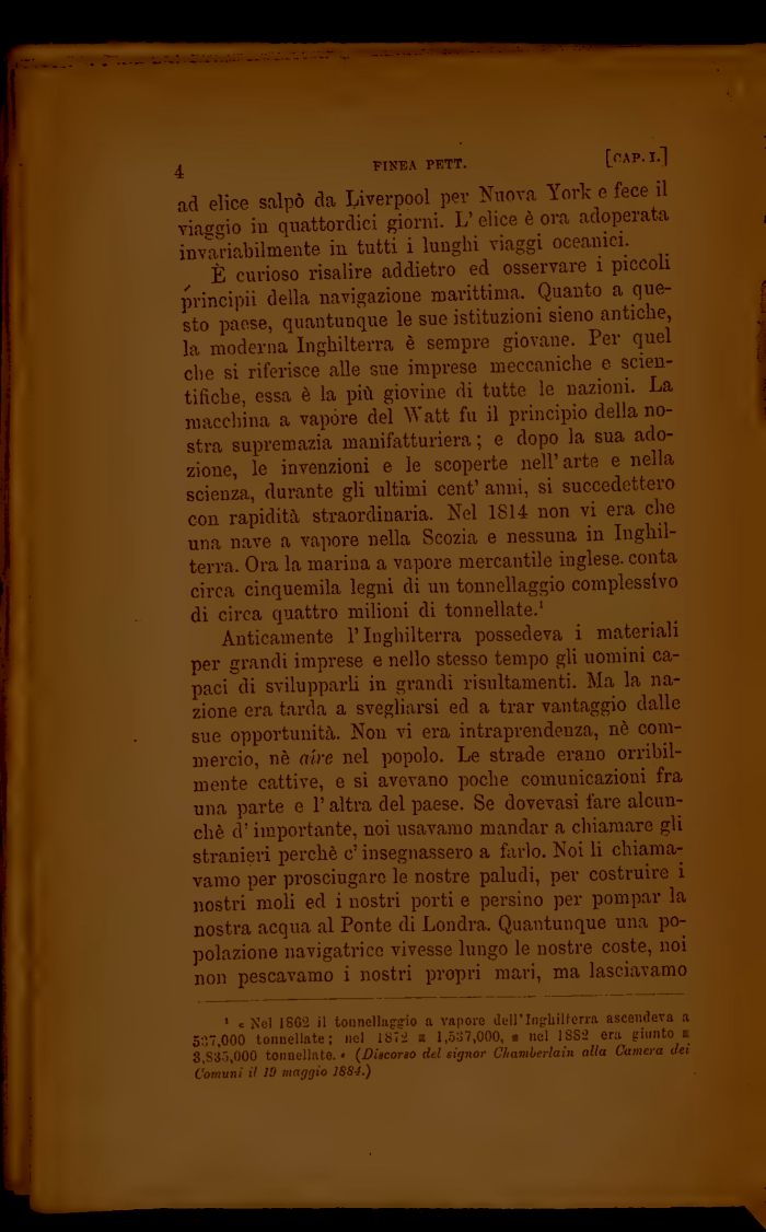1 = Nel 1S02 il tonnellaggio a vapore dell'Inghilterra ascendeva a SoT.OOO tonnellate; nel IS7i i 1,537,000, a nel 1SS2 era giunto s S,S35,000 tonnellate. • (Diacono del signor Chamlerlain alla Camera dei Comuni il 19 maggio 1684.)