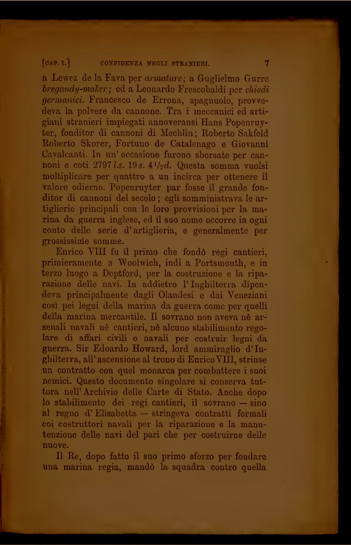a Lewez de la Fava per armature; a Guglielmo Gurre bregandy-mdker; ed a Leonardo Frescobaldi per chiodi germanici. Francesco de Errona, spagnuolo, provvedeva la polvere da cannone. Tra i meccanici ed artigiani stranieri impiegati annoveransi Hans Popenruy-ter, fonditor di cannoni di Mecblin; Roberto Sakfeld Roberto Skorer, Fortuno de Catalenago e Giovanni Cavalcanti. In un' occasione furono sborsate per cannoni e coti 2797 l.s. 19 s. 4'/uri!. Questa somma vuoisi moltiplicare per quattro a un incirca per ottenere il valore odierno. Popenruyter par fosse il grande fonditor di cannoni del secolo ; egli somministrava le artiglierie principali con le loro provvisioni per la marina da guerra inglese, ed il suo nome occorre in ogni conto delle serie d'artiglieria, e generalmente per grossissiuěe somme.