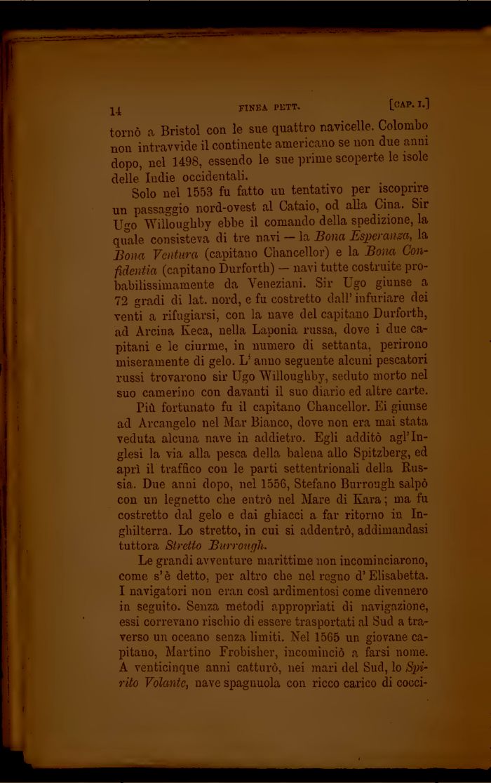 Solo nel 1553 fu fatto uu tentativo per iscoprire un passaggio nord-ovest al Cataio, od alla Cina. Sir Ugo Willoughby ebbe il comando della spedizione, la quale consisteva di tre navi — la Bona Esperansa, la Bona Ventura (capitano Chancellor) e la Bona Con-fidentia (capitano Durforth) — navi tutte costruite probabilissimamente da Veneziani. Sir Ugo giunse a 72 gradi di lat. nord, e fu costretto dall' infuriare dei venti a rifugiarsi, con la uave del capitano Durforth, ad Arcina Keca, nella Laponia russa, dove i clue capitani e le ciurme, in numero di settanta, perirono miseramente di gelo. L'anno seguente alcuni pescatori russi trovarono sir Ugo Willougkby, seduto morto nel suo camerino con davanti il suo diario ed altre carte.