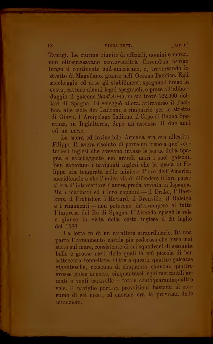 La sacra ed invincibile Armada era ora allestita. Filippo II aveva risoluto di porre un freno a que' venturieri inglesi che avevano invaso le acque della Spagna e saccheggiato nei grandi mari i suoi galeoni. Ben sapevano i naviganti inglesi che la spada di Filippo era temprata nelle miniere d' oro dell' America meridionale e che l'unica via di difendere il loro paese si era d'intercettare l'aurea preda avviata in Ispagna. Ma i marinari ed i loro capitani — il Drake, l'Haw-kins, il Frobislier, l'Howard, il Grenville, il Raleigh e i rimanenti — non poterono interrompere al tutto l'impresa del Re di Spagna. L'Armada spiegò le vele c giunse in vista della costa inglese il 20 luglio del 1588.