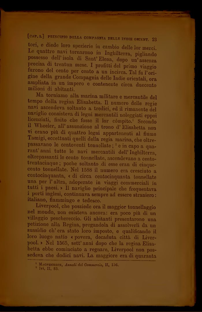 Liverpool, che possiede ora il maggior tonnellaggio nel mondo, non esisteva ancora: era poco pił di un villaggio peschereccio. Gli abitanti presentarono una petizione alla Regina, pregandola di assolverli da un sussidio clr era stato loro imposto, e qualificando il loro luogo natio < povera, decaduta cittą di Liverpool. » Nel 1565, sett' anni dopo che la regina Elisabetta ebbe cominciato a regnare, Liverpool non possedeva che dodici navi. La maggiore era di quaranta