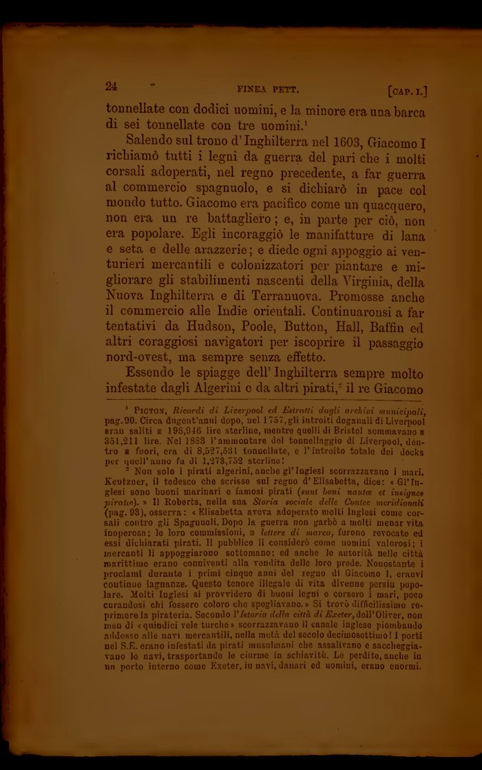 2 Non solo i pirati algerini, anche gì' Inglesi scorrazzavano i mari. Keutzner, il tedesco che scrisse sul regno d'Elisabetta, dice: «Gl'Inglesi sono buoni marinari e famosi pirati (suiti Ioni nauta: et insignes pirati*), » Il Koberts, nella sua Storia sociale delle Contee meridionali (pag. 93), osserva : «Elisabetta aveva adoperato molti Inglesi come corsali contro gli Spagnuoli. Dopo la guerra non garbò a molti menar vita inoperosa; le loro commissioni, n lettere di marca, furono revocato ed essi dichiarati pirati. 11 pubblico li considerò come uomini valorosi; i mercanti li appoggiarono sottomano: ed anche lo autorità nello città marittime erano conniventi alla vendita dello loro prede. Nonostante i proclami durante i primi cinque anni del regno dì Giacomo 1, erauvi coutinuo lagnanze. Questo tenore illegale ili vita divenne persiu popolare. Molti Inglesi si provvidero di buoni legni e corsero ì mari, poco curandosi chi fossero coloro che spogliavano.» Si trovò diflìcilissìmo reprimerò la pirateria. Secondo V Istoria della città di Exeter, doli' Oli ver, non mea di «quindici vele turche¦ scorrazzavano il canale inglese piombaudo addosso alle navi mercantili, nella metà del secolo decimosottinio! I porti nel S.E. erano infestati da pirati musulmani che assalivano e saccheggiavano lo navi, trasportando le ciurme in schiavitù. Le perdite, anche in un porto intorno come Exeter, in navi, danari ed uomini, erano enormi.