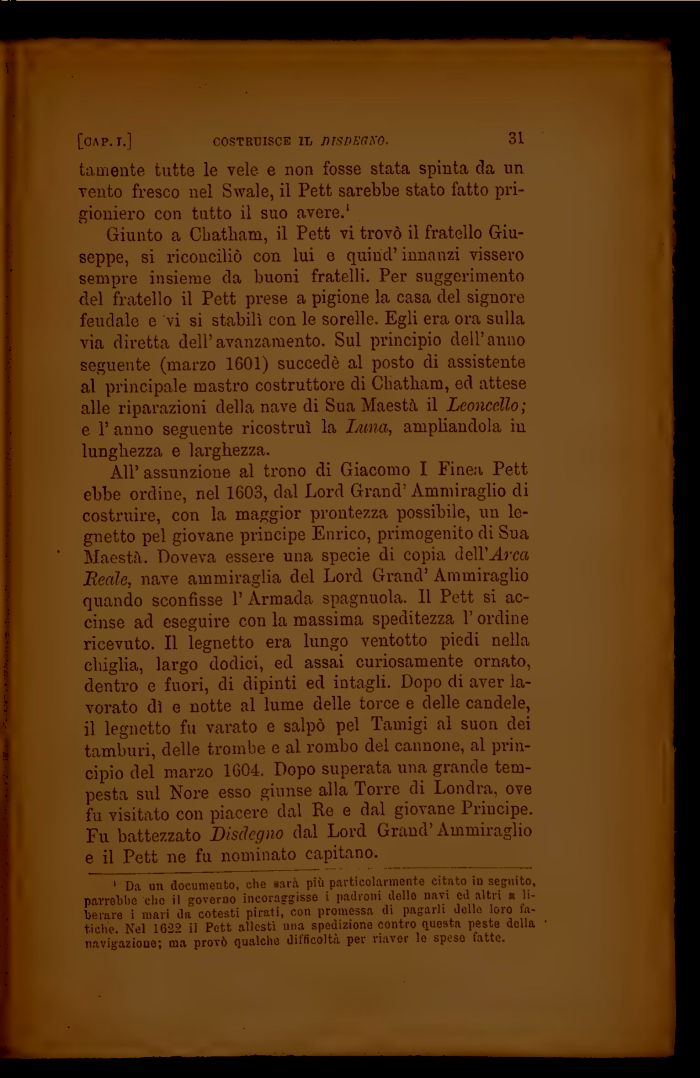 All' assunzione al trono di Giacomo I Finea Pett ebbe ordine, nel 1603, dal Lord Grand' Ammiraglio di costruire, con la maggior prontezza possibile, un le-gnetto pel giovane principe Enrico, primogenito di Sua Maestà. Doveva essere una specie di copia dell'ami Beale, nave ammiraglia del Lord Grand' Ammiraglio quando sconfisse 1' Armada spagnuola. 11 Pett si accinse ad eseguire con la massima speditezza l'ordine ricevuto. Il legnetto era lungo ventotto piedi nella chiglia, largo dodici, ed assai curiosamente ornato, dentro e fuori, di dipinti ed intagli. Dopo di aver lavorato dì e notte al lume delle torce e delle candele, il legnetto fu varato e salpò pel Tamigi al suon dei tamburi, delle trombe e al rombo del cannone, al principio del marzo 1604. Dopo superata una grande tempesta sul Kore esso giunse alla Torre di Londra, ove fu visitato con piacere dal Re e dal giovane Principe. Fu battezzato Disdegno dal Lord Grand'Ammiraglio e il Pett ne fu nominato capitano.