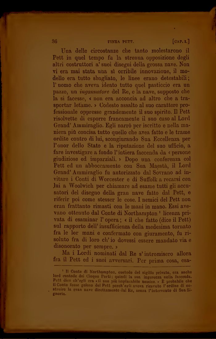 ' 11 Conte di Northampton, custode del sigillo privato, era anche lord custode dei Cinque Porti ; quindi la sua ingerenza nella faccenda. Pett dice ch'egli era «il suo più implacabile nemico. » È probabile che il Conte fosse geloso del Pett perch'eirli aveva ricevuto l'ordine di costruire la gran nave direttamente dal Re, senza l'intervento di Sua Signoria.