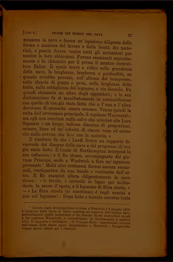 1 Cotesta regia investigazione avvenne a Woolwich l'S maggio 1609. L'Archivio dello Carte di Stato contiene un rapporto dell'istessa data, probabilmente quello presentato al Ke, firmato da sei costruttori navali r dal capitano Waymouth, ¦ controfirmato da Northampton e quattro altri. lì rapporto è intitolato: «Il Principe Reale : imperfezioni trovate nell'esame della nuova opera incominciata a Woolwicb.» Occnporebbo troppo spazio riferir qui i risultati.