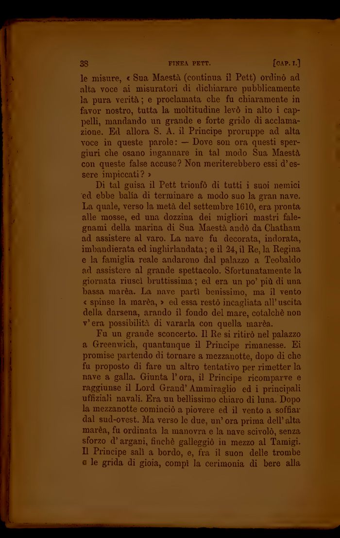 Di tal guisa il Pett trionfò di tutti i suoi nemici ed ebbe balla di terminare a modo suo la gran nave. La quale, verso la metà del settembre 1610, era pronta alle mosse, ed una dozzina dei migliori mastri falegnami della marina di Sua Maestà andò da Ckatham ad assistere al varo. La nave fu decorata, indorata, imbandierata ed inghirlandata; e il 24, il Re,la Regina e la famiglia reale andarono dal palazzo a Teobaldo ad assistere al grande spettacolo. Sfortunatamente la giornata riuscì bruttissima ; ed era un po' più di una bassa marèa. La nave partì benissimo, ma il vento < spinse la marèa, > ed essa restò incagliata all'uscita della darsena, arando il fondo del mare, cotalchè non v'era possibilità di vararla con quella marèa.