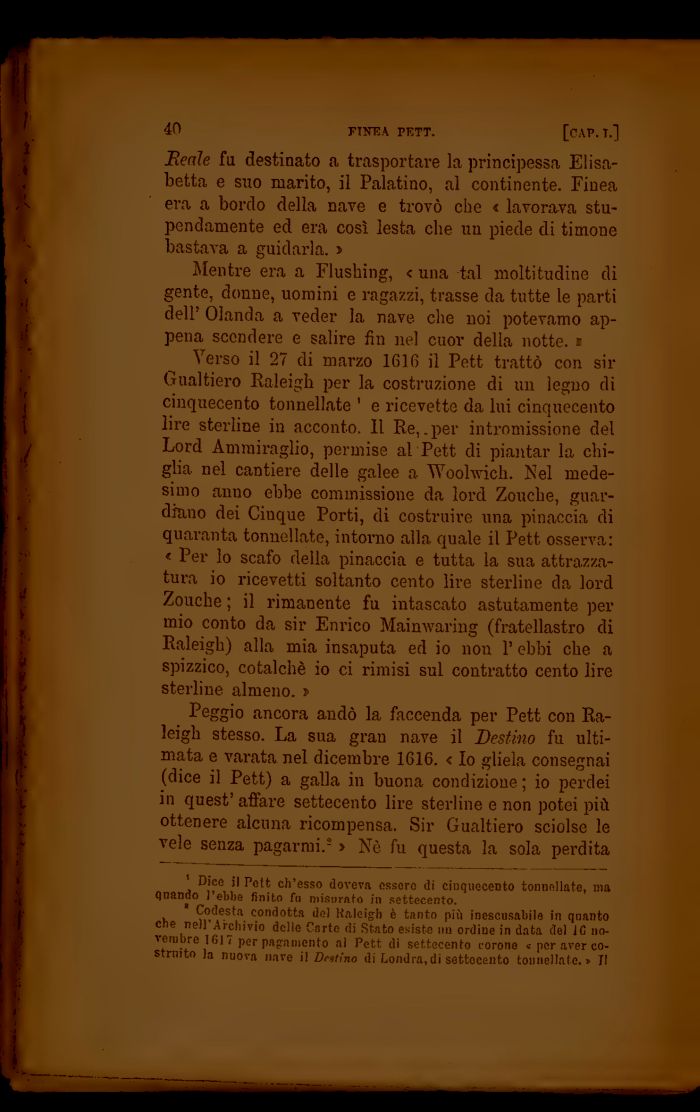 Peggio ancora andò la faccenda per Pett con Raleigh stesso. La sua gran nave il Destino fu ultimata e varata nel dicembre 1616. < Io gliela consegnai (dice il Pett) a galla in buona condizione ; io perdei in quest' affare settecento lire sterline e non potei più ottenere alcuna ricompensa. Sir Gualtiero sciolse le vele senza pagarmi.2 > Nè fu questa la sola perdita