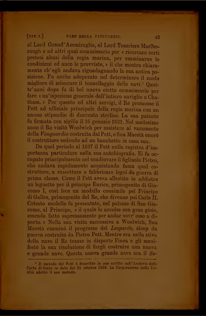 al Lord Grand'Ammiraglio, al Lord Tesoriere Marlbo-rough e ad altri qual commissario per « ricercare certi pretesi abusi della regia marina, per esaminarne le condizioni ed anco le provviste, » il che mostra chiaramente ch'egli andava riguadagnando la sua antica posizione. Fu anche adoperato nel determinare il modo migliore di misurare il tonnellaggio delle navi.1 Quatti-'anni dopo fu di bel nuovo eletto commissario per fare «un'ispezione generale dell'intiero naviglio a Chatham. > Per questo ed altri servigi, il Re promosse il Pett ad uffiziale principale della regia marina con un annuo stipendio di duecento sterline. La sua patente fu firmata con sigillo il 16 gennaio 1631. Nel medesimo anno il Re visitò Woolwich per assistere al varamento della Vanguardia costruita dal Pett, e Sua Maestà onorò il costruttore sedendo ad un banchetto in casa sua.