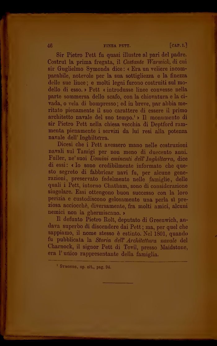 Dicesi clie i Pett avessero mano nelle costruzioni navali sul Tamigi per non meno di duecento anni. Fuller, ne'suoi Uomini eminenti dell'Inghilterra, dice di essi : < Io sono credibilmente informato che questo segreto di fabbricar navi fu, per alcune generazioni, preservato fedelmente nelle famiglie, delle quali i Pett, intorno Chatham, sono di considerazione singolare. Essi ottengono buon successo con la loro perizia e custodiscono gelosamente una perla sì preziosa acciocché, diversamente, fra molti amici, alcuni nemici non la ghermiscano. >