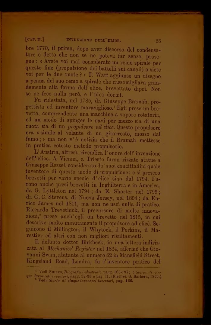 Fu ridestata, nel 17S5, da Giuseppe Bramali, progettista ed inventore maraviglioso.1 Egli prese un brevetto, comprendente una macchina a vapore rotatoria, ed uu modo di spinger le navi per mezzo sia di una ruota sia di un propulsore ad elice. Questo propulsore era « simile al volante di un girarrosto, mosso dal fumo ; ì ma non v' è notizia che il Bramali mettesse in pratica cotesto metodo propulsorio.
