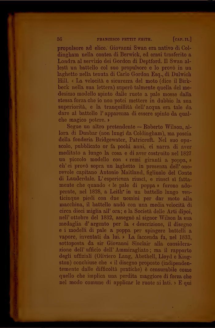 Segue un altro pretendente — Roberto Wilson, allora di Dunbar (non lungi da Coldingham), ma poscia della fonderia Bridgewater, Patricroft. Nel suo opuscolo, pubblicato or fa pochi anni, ei narra di aver meditato a lungo la cosa e di aver costruito nel 1827 un piccolo modello con < remi giranti a poppa, » eh' ei provò sopra un laghetto in presenza dell' onorevole capitano Antonio Haitiane!, figliuolo del Conte di Lauderdale. L'esperienza riuscì, e riuscì sì fattamente che quando < le pale di poppa « furono adoperate, nel 1828, a Leith' in un battello lungo venticinque piedi con due uomini per dar moto alla macchina, il battello andò con una media velocità di circa dieci miglia all' ora; e la Società delle Arti dipoi, nell' ottobre del 1832, assegnò al signor Wilson la sua medaglia d'argento per la < descrizione, il disegno e i modelli di pale a poppa per spingere battelli a vapore, inventati da lui. » La faccenda fu, nel 1833, sottoposta da sir Giovanni Sinclair alla considerazione dell' ufficio dell' Ammiragliato ; ma il rapporto degli uffiziali (Oliviero Lang, Abethell, Lloyd e Kingston) conchiuse che « il disegno proposto (indipendentemente dalle difficoltà pratiche) è censurabile come quello che implica una perdita maggiore di forza che nel modo comune di applicar le ruote ai lati. » E qui